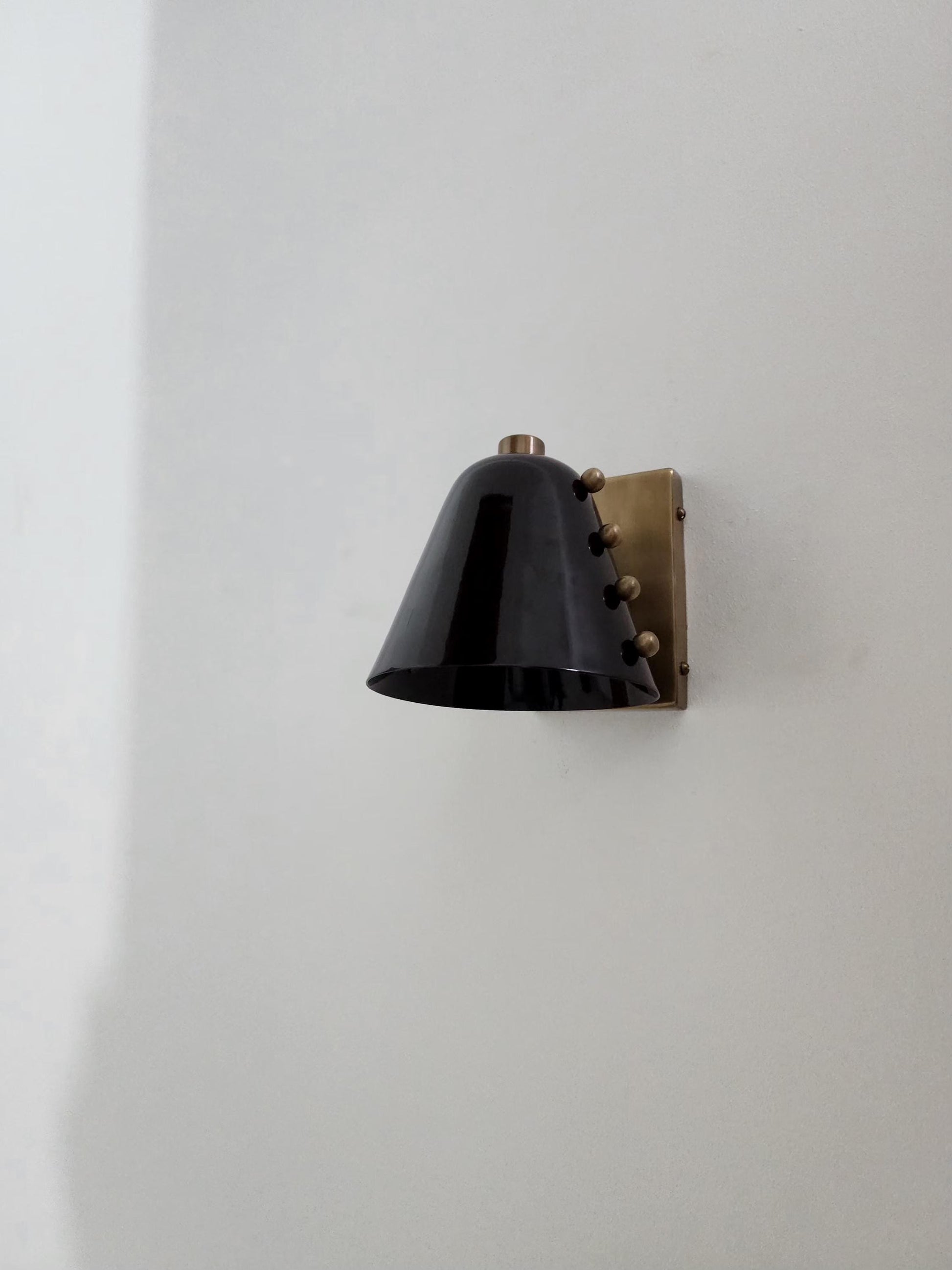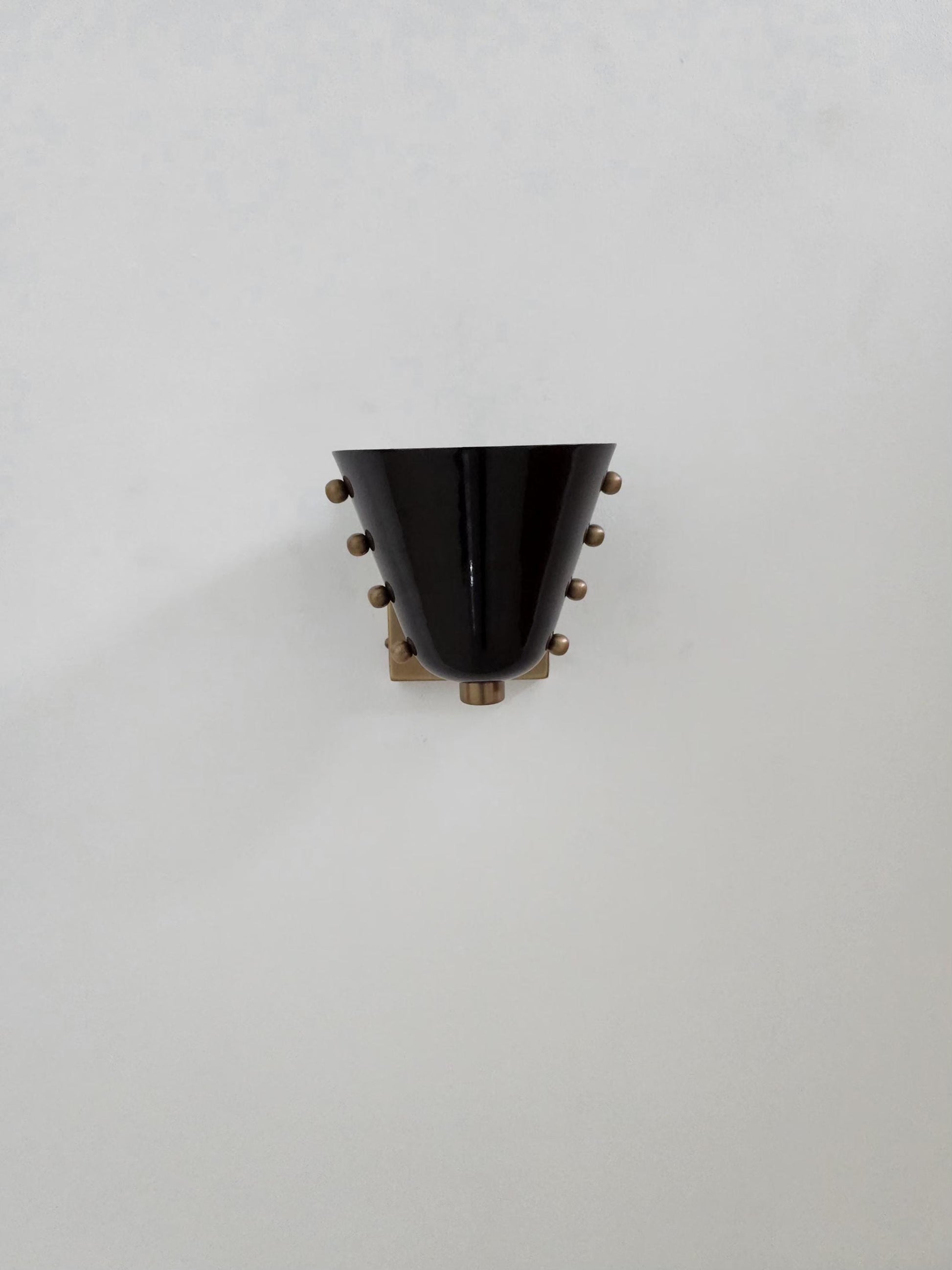 Elevate your space with this striking brass wall sconce that blends sculptural form with timeless function. Featuring a beautifully tapered cone shade and distinctive rivet-style detailing, this handcrafted piece brings character and warm ambient light to any room.